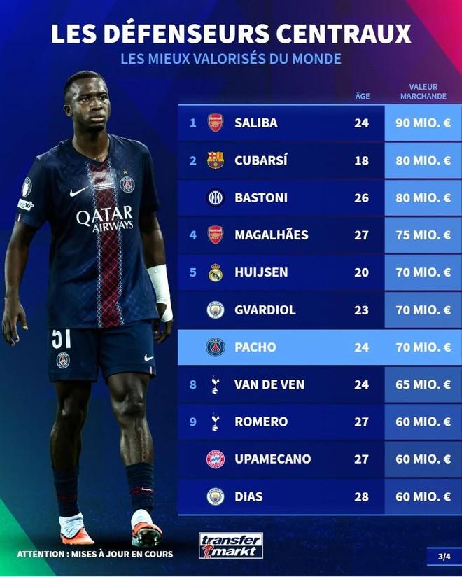 北京时间12月15日,在更新了法甲球员的身价之后,德转列出了目前世界足坛身价排名前10的中后卫,此次更新后身价涨至7000万欧元的威廉-帕乔并列第五,萨利巴9000万欧元第一,库巴西和巴斯托尼8000万欧元并列第二。